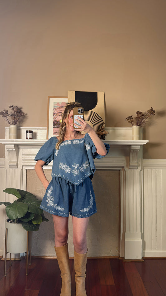 Floral Embroidery Denim Top and Shorts Set