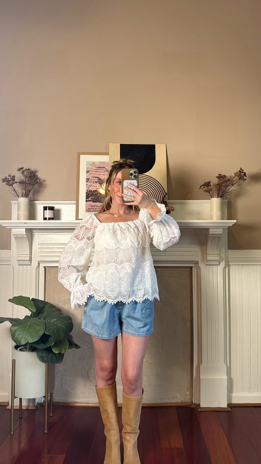 Embroidered Eyelet Lace Square Neck Blouse